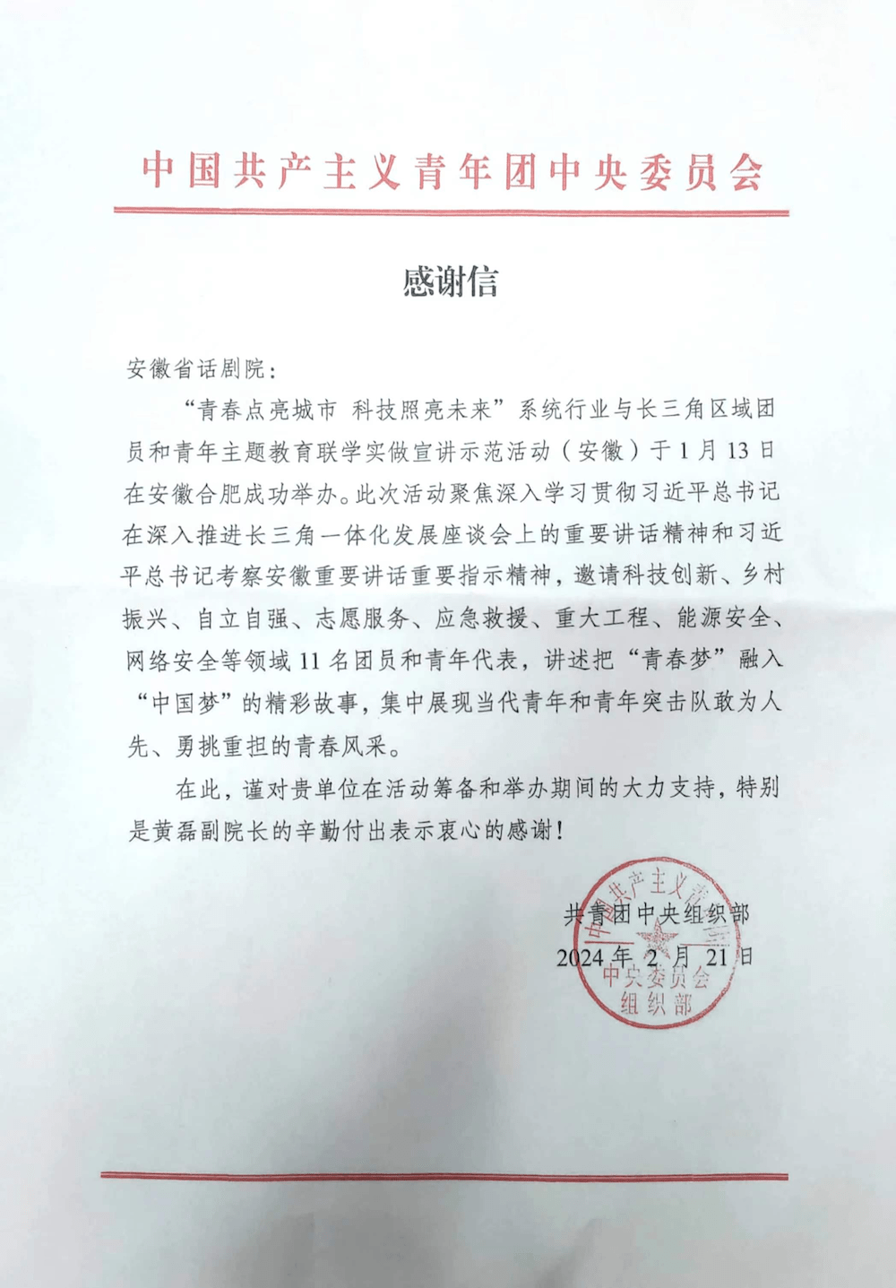 感谢信指出,该活动聚焦深入学习贯彻习近平总书记在深入推进长三角一体化发展座谈会上的重要讲话精神和习近平总书记考察安徽重要讲话重要指示精神,邀请科技创新、乡村振兴、自立自强、志愿服务、应急救援、重大工程、能源安全、网络安全等领域的11名团员和青年代表,讲述他们将“青春梦”融入“中国梦”的精彩故事。本次活动筹备工作时间紧、任务重、要求高,我院副院长黄磊从舞台效果、视觉呈现、语言表述等各方面全方位把关,临近演出,依然在活动现场进行最后打磨锤炼,力争将舞台效果展现到最好!下一步,我院继续秉承新时代文艺工作者的责任与担当,发挥国有文艺院团的引领作用,继续争当文艺工作的急先锋,在新的起点继续推动社会主义文化繁荣兴盛。